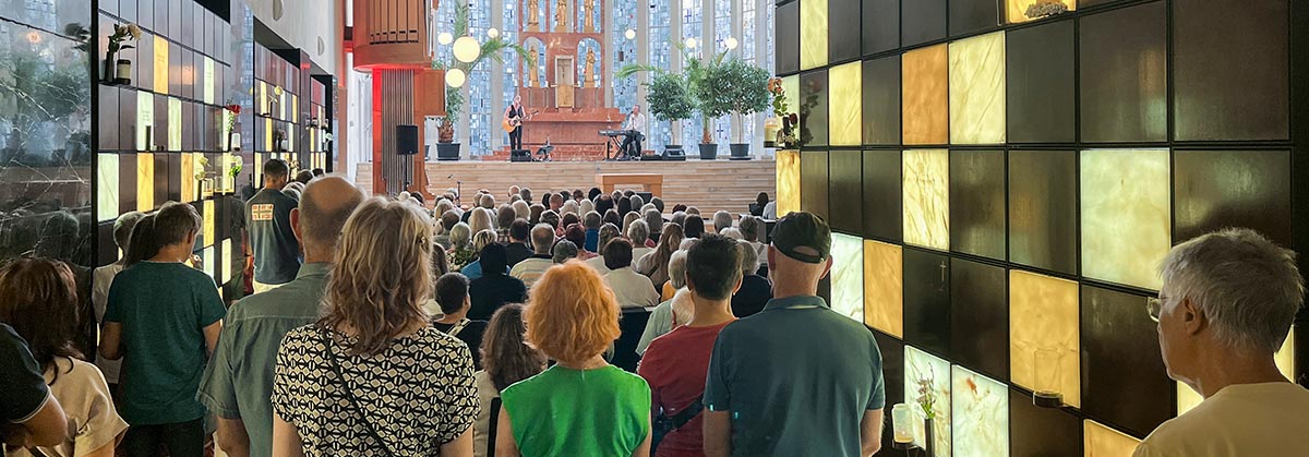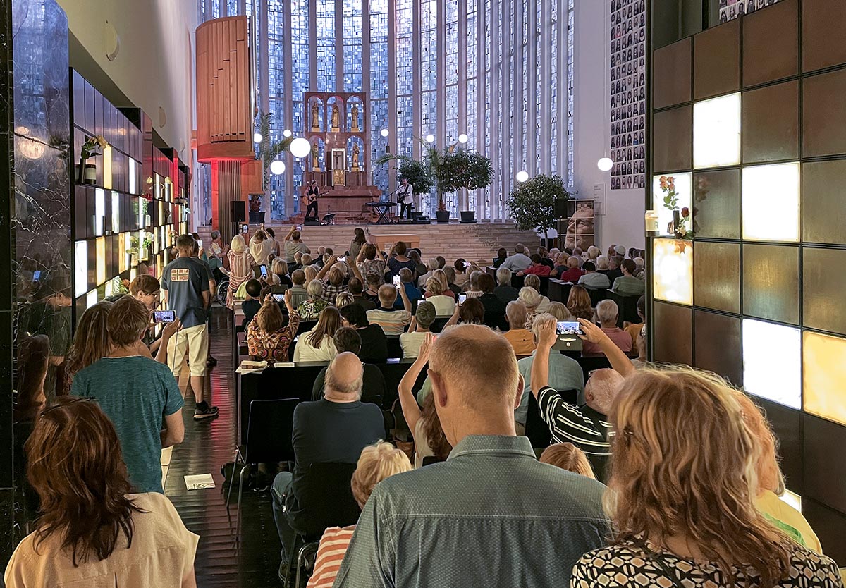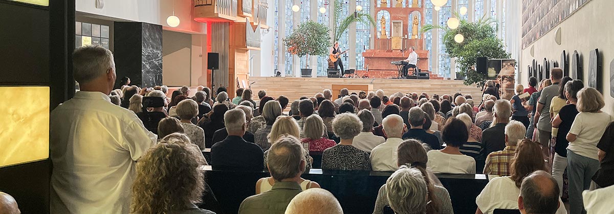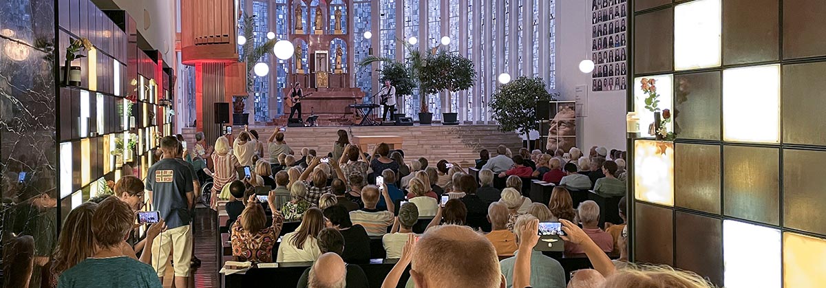Am heißesten Tag des Jahres ging nicht nur kein Hauch von Wind; das St. Kamillus Kolumbarium war mit rund 300 Gästen auch bis auf den letzten Platz voll besetzt. Alle freuten sich über die ausgelegten Imagebroschüren der Grabeskirche. Waren sie doch höchst willkommener Fächer-Ersatz und steigerten die Freude am Konzert von Delta Mouse.